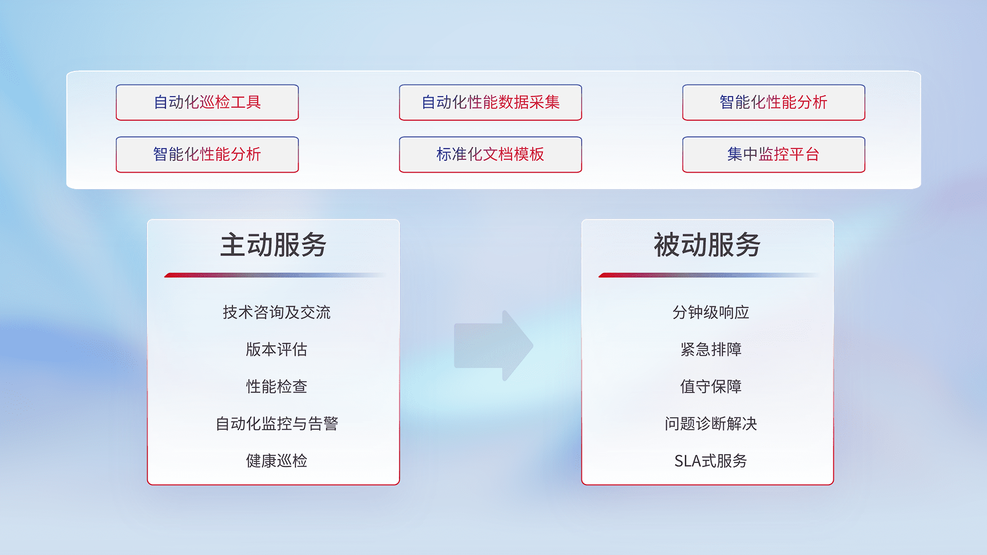 智能化工具和标准化文档,,,保障服务质量,,,提供主动服务(包含技术咨询、、版本评估、、性能检查、、自动化监控与告警、、、、健康巡检)和被动服务包含(分钟级响应、、、、紧急排障、、、、值守保障、、、、问题诊断解决、、、、SLA服务)。。。