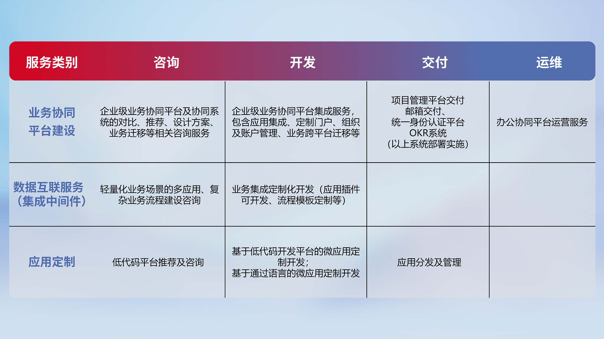 针对钉钉、、、、企微、、、、IDaas等平台级产品提供产品的规划、、、方案、、、交付、、、、定制化开发等服务,,,,实现如统一协同办公、、智能客户服务、、混合会议管理、、、、智能数据查询、、等业务场景,,实现数字化转型。。。